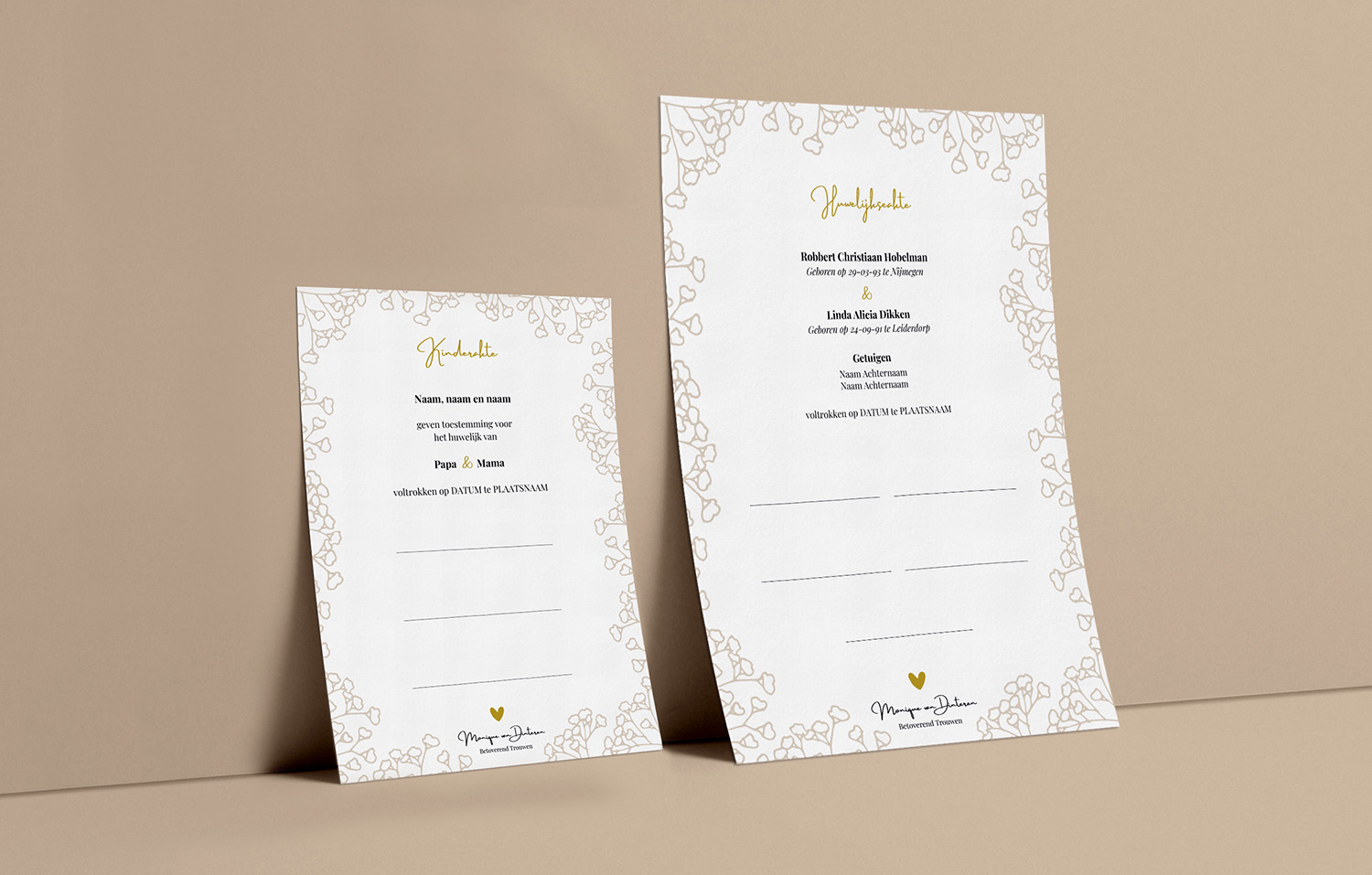 September 2022 mochten wij gebruik maken van Monique haar diensten als trouwambtenaar. En nu mochten wij voor haar aan de slag voor een nieuwe branding. Doordat we zelf onder haar doelgroep vallen én we elkaar inmiddels kende konden we direct aan de slag. Gipskruid, een klein romantisch bloemetje, werd de basis van de branding. In combinatie met het goudfolie geeft het het geheel een chique look. Zie hieronder een deel van het eindresultaat.