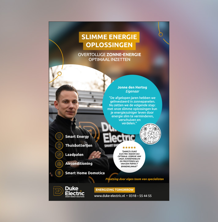 Duke Electric zorgt voor slimme energieoplossingen die voldoen aan de hoogste normen. In het beeldmerk van het logo van Duke Electric zie je de letter D(uke) en E(lectric) terug in combinatie met de bolletjes die staan voor hernieuwbare energie. Met het verloop creëer je ook direct een beweging. Bekijk hier beneden het logo en beeldmerk en de andere huisstijl uitingen: Autobestickering en visitekaartje. – In opdracht van Comfy.
